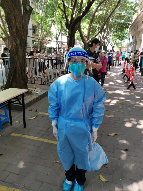 景泰云苑社区属于管控区,社区人员只准进不准出,这对很多居住在社区的居民来说,无疑会产生诸多不便,志愿者们就成为他们的“守护天使”了。余雪葵作为其中一员,主要负责在景泰云苑社区核酸检测采样点是维护现场秩序。4月9号下午15:00时,她赶到志愿服务现场,在社区分配了工作后,便穿上了防护服,佩戴了防护面罩等,开始志愿服务工作,一干就到了晚上21:00时。期间,她为了不想浪费一套防护服,便不喝水,当天天气很热,连续工作几个小时下来,整套防护服、头发都湿透了,但她从不喊累。