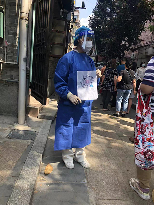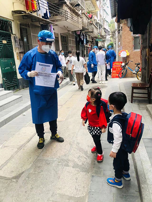 自同德街道成为管控区后,阮志明便全天候投入到社区志愿服务中,摸查居民疫苗接种情况、帮助居民核对身份信息……社区街头总能看到他忙碌的身影。身为共青团员的女儿阮颖妍也不甘落后,在每天上午的线上课程结束后,就跟随父亲一起成为社区中的“大白”之一。