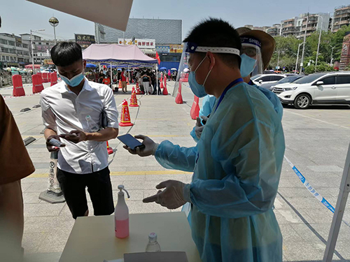 4月12日,张月荣觉得自己的脚伤好很多了,已经可以走路了,虽然走起路来还是有点一拐一拐,于是他开开心心地出门,和队友们一起参加当天的核酸检测点志愿服务。他今天负责服务核酸检测点里的“老年人专列”,他耐心地指引老人们排队、打开手机、扫检测二维码、填报资料,对于老人们的任何疑问,他都仔细回答;遇到老人的手机无法扫码或者填报资料时,张月荣用自己的手机帮他们操作。张月荣的手机一天要充3、4次电,“幸好我带了2个充电宝来,能够支撑手机一天的电量。”张月荣感到安心。长时间的站立让张月荣脚伤处有点不适,他随身携带了铁打喷雾,觉得脚不舒服了就喷一下。“我会在做好工作的同时,好好用药治疗脚伤的,我希望能尽快康复,更好地投入工作。”