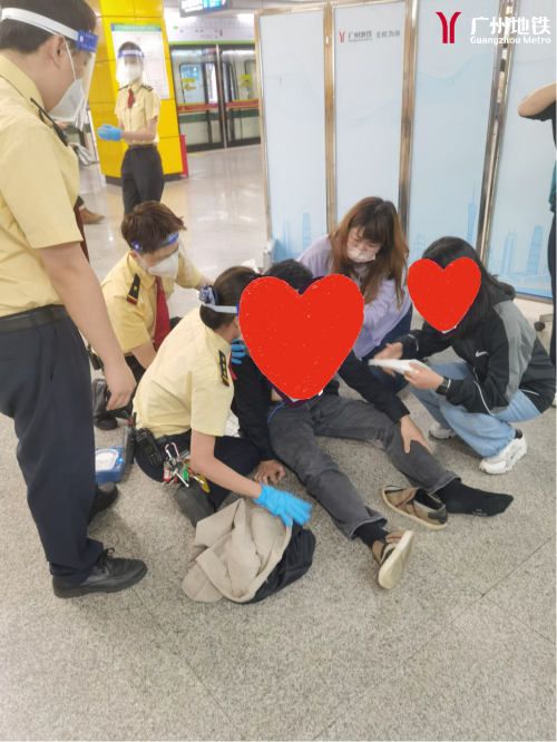 “啊!快帮帮忙,救救他!”18日晚上20:16,广州南站站台岗梁俊杰在7号线列车清客完毕刚下车,突然听到旁边有乘客惊声呼救,他立即循声跑上前查看,只见一名男乘客晕倒在地,一旁的妻女惊慌之余大声向周围求助。梁俊杰一边迅速蹲下查看男乘客的情况,只见其唇色惨白,已无意识,呼吸微弱,一边立即上报车控室请求支援。车控室第一时间致电120,并开启车站广播寻找医护人员。下班路过的另一名地铁员工李莉见状也加入救助行列。