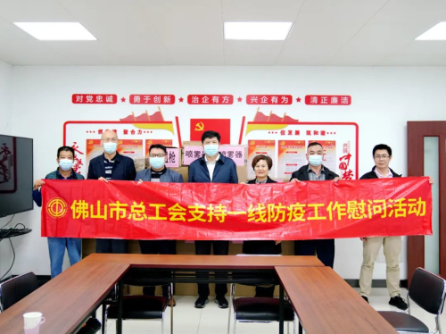 佛山市总工会副主席蒋庆(左四)向公司送上防疫物资