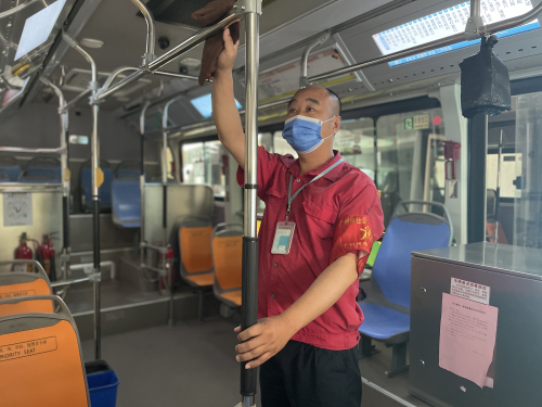 今年49岁的陈荣镜是广州巴士集团增城分公司一名14路线公交车车长。“五一”这天,陈师傅5时30分就来到了始发站增城客运站,“今天是举国同庆的日子,祝福家人朋友身体健康, 山河无恙。”说起今天坚守岗位,陈师傅表示,在这个美好的日子里,能为市民安全出行出一份力,自己也挺开心的。说着,陈师傅便开始打扫卫生、检查车辆,按上级防疫措施要求落实做好消毒保洁工作,6点正准时从增城站出发,开始这一天的工作。