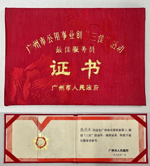 在成为班车驾驶员的这15年期间,张列光还获得了很多荣誉,比如广州市人民政府颁发的“广州市公用事业创‘三佳’活动最佳服务员”荣誉称号,要获得这个称号,必须在上一年全年里面,在营运、安全服务、卫生等方面全都要达到规定的指标,在最后阶段还要进行驾驶技术比赛,评选目的是带动良好的服务行业风气,这个红色丝绸质地封面烫印金字的证书,张列光一直珍藏着,这个证书鼓励和提醒他,在往后的职业生涯里,也要爱岗敬业、尽职尽责。张列光还获得过公司颁发的“十大杰出青年”,优秀职工、优秀驾驶员等等的奖项,不胜枚举。当年,评选高级驾驶员技师时,可以根据所获荣誉级别进行加分,于是张列光捧着一大箱证书去到现场,评选人员翻了几本证书后,向张列光表示,由于他的荣誉很多,加分都加到满分了,直接可以评上高级技师。1994年,表现优异的张列光如愿加入了中国共产党。