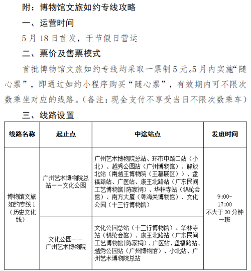 据介绍,首批博物馆文旅如约专线共3条,串联起广州市内近20家博物馆,并与地铁多条线路及区域内常规公交线网相接驳,能有效缩短沿线博物馆之间的时空距离,极大提高参观效率和便利度,晨于广州博物馆登楼看羊城美景、夕至十三行博物馆听一曲海上丝绸之路挽歌,一天览尽广州千年文明史。