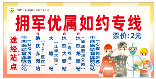 为积极落实拥军优属政策,大力营造“优待军人军属、尊崇军人”的良好社会环境,进一步弘扬拥军优属、拥政爱民的优良传统,5月27日,广州巴士集团电车分公司践行“我为群众办实事”实践活动,联合海珠区江海街道、南方医科大学中西医结合医院、广州军区第十三离职干部休养所,开通拥军优属便民如约专线(中西医结合医院总站环线)。