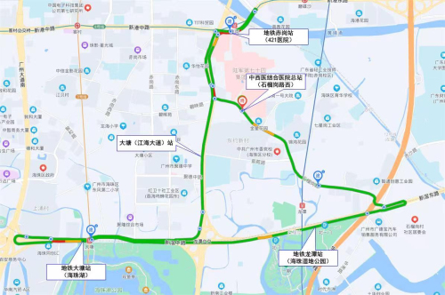拥军优属便民如约专线(中西医结合医院总站环线)途经石榴岗路、江海大道中、新港东路、江海大道中、新滘中路、石榴岗路等路段,线路站点设置为中西医结合医院总站(石榴岗路西)、地铁赤岗站(421医院)、大塘(江海大道)、地铁大塘站(海珠湖)、地铁龙潭站(海珠湿地公园)、中西医结合医院总站(石榴岗路西)等站点,全程约35分钟,服务时间为周一至周日07:00-10:30;15:30-19:00,全天发班间隔不大于20分钟。