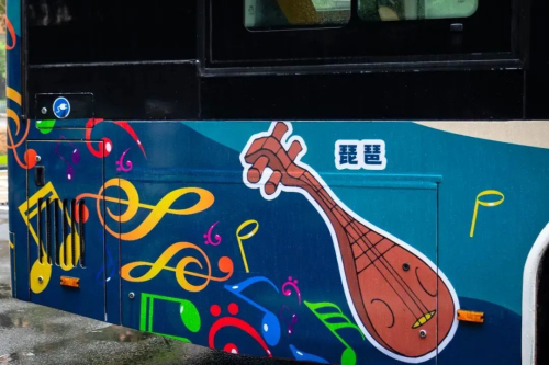 车身底色以鲜艳的色块拼接,展现民族音乐中行云流水的感觉,辅以音符点缀,让观众仿佛徜徉在音乐海洋中。