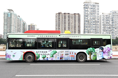 “老广州新风情”主题巴,车身以鲜绿色为主色调,展现常年树木苍翠欲滴、繁花姹紫嫣红的广州街头景象。近年来,广州通过打造历史文化街区、改造老城区等一系列措施来使老城街巷焕发新颜、实现老城市新活力。围绕“老广州新风情”主题,车身左侧描绘中山路骑楼老街、百年国货店等历史建筑以及穿着民国服装的行人互动画面,勾起乡愁记忆。车身右侧以东山风情为主,描绘以东山洋楼近代建筑群为主体的新打造的新河浦历史文化街区,以及东濠涌、天字码头等历史景点。车尾描绘了广州老城区改造的一个示范点——惠吉西,整体展现了广州这座城市的和谐、友爱与活力。