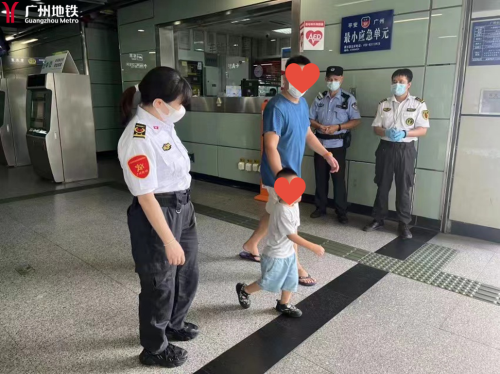 8月11日15:00左右,广州地铁六号线沙贝站B口,两名乘客进站安检时找到安检员表示:“有一名小孩跟着我们,从恒大御景半岛一路来到沙贝地铁站,但我们并不认识这小孩。”安检员朱硕豪听后立即传达安检班长杨世玉,杨世玉到场看到站在一边孤零零的小孩,上前耐心地询问其情况:“你好呀小朋友,你叫什么名字呀?是和父母走散了吗?你知道你父母在哪里吗?”然而小孩年龄太小,无法了解到有效信息。为了确保小孩的安全,杨世玉立即上报辅警、车控室,同时辅警联系民警到场,在感谢了两名热心乘客后,杨世玉全程陪伴小孩来到沙贝站警务室。