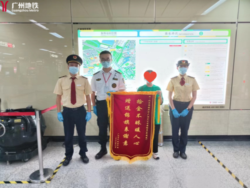 9天之后,该名乘客再次来到在十三号线鱼珠站,亲手送上一面印有“拾金不昧暖人心”的锦旗表达感谢。