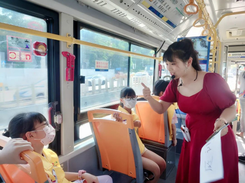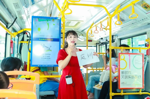 “早在遥远的春秋时期,孔子对于子孙的教育有一个特别的名称,不叫家训,而叫庭训,为什么叫庭训呢?这要从一个小故事说起……”随着公交缓缓启动,公交车厢化身“流动课堂”,特邀讲师王慧讲起了故事,与参与活动的中小学生共同开启了一场文明之旅。