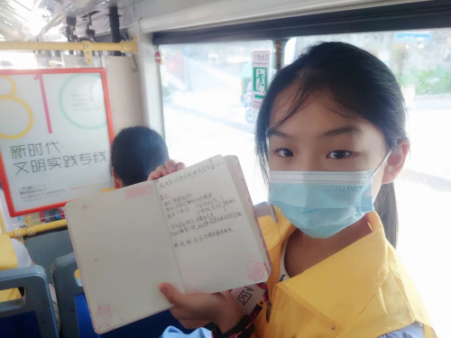 在公交车厢里上课是啥体验?“边看风景边听故事很有趣,在车里听课感觉记忆都更深刻了,我还学了几句论语。” 参与活动的小学生蔡诗茵感叹道,还打开小本本晒起了自己做的笔记。