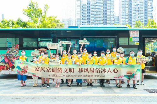 据了解,今年龙岗区以810线路公交为载体,进行实体包装,创新打造新时代文明实践专线。该专线在外观设计上,通过客家麒麟、传统建筑代表以及龙岗地标大运中心,串联过去与未来,体现龙岗文明的传承与发展;此外,面向全社会征集“文明乘车公约”,将话筒交给城市主人翁,还邀请儿童一笔一画绘文明,并将相关成果融于车厢展示中,整体打造尽显文明元素的创意表达。