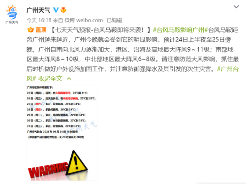 据@广州天气 预测,台风马鞍24日上半夜至25日傍晚,广州自南向北风力逐渐加大,港区、沿海及高地最大阵风9~11级;南部地区最大阵风8~10级,中北部地区最大阵风6~8级。