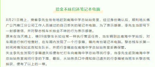 无独有偶,在8月20日中午,市民范先生在九江大道公交枢纽站站务室,领回了自己先前遗失的手机,为了表示感谢,范先生当即写下一封感谢信,并为佛广公汽樵江分公司255A公交车长林振祥拾金不昧的行为点赞。