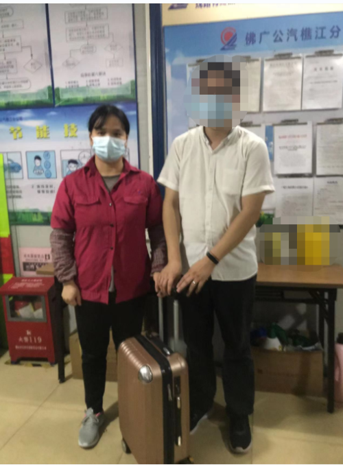 8月20日上午,乘客覃先生来到佛广公汽高新分公司丹灶车站站务室,从250线车长罗永林手上接过自己丢失的手拎袋,并连声致谢:“十分感谢公交车长帮我拾回手拎袋,为你们的高尚品德点赞!”