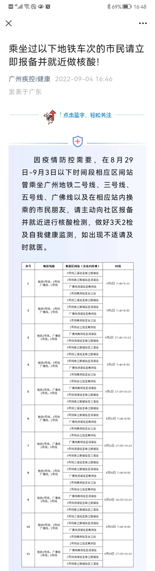 另据广州疾控消息,因疫情防控需要,在8月29日-9月3日以下时间段相应区间站曾乘坐广州地铁二号线、三号线、五号线、广佛线以及在相应站内换乘的市民朋友,请主动向社区报备并就近进行核酸检测,做好3天2检及自我健康监测,如出现不适请及时就医。