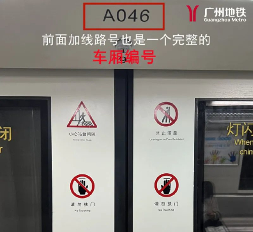 除了车厢两端有车厢编号外,车门框上也有“车厢编号”。每节车厢两端的上方,有一组“数字+字母+数字”的组合,这个是车厢的编号,在车门边上也有一组“字母+数字”的组合,在这个组合前加上线路号,也是一个完整的车厢编号。
