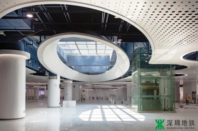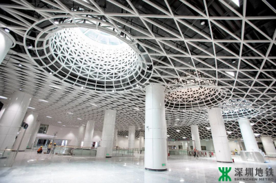 岗厦北枢纽内核心换乘区的中心景观,是以“深圳之眼”为主题,引入费马螺旋线双向延伸,体现了深圳“汇聚、包容、国际化”文化特征。其中,天眼中庭的设计采用了48X51.2米地下超大跨度组合结构,与彩田立交桥合建,结构复杂,设计建设难度极大,该结构跨度之大在国内外明挖地下结构中也尚属首次。