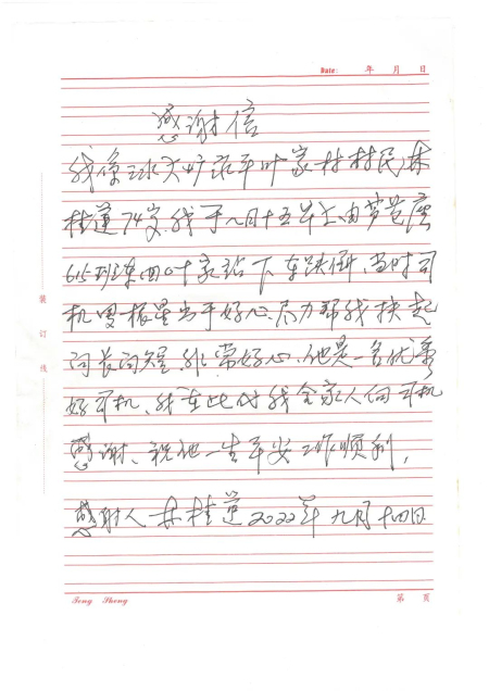 “多谢司机罗振星,他很好心!他虽然年轻但是对我们这些老人家很体贴!”9月14日上午,一位年过7旬的老伯专程来到三水粤运公司的车队调度室,替老伴送上一封手写的感谢信,特意感谢几天前好心给他的老伴林婆婆提供帮助的615线公交司机罗振星。