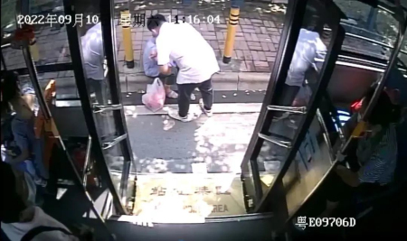 司机和热心乘客上前扶起摔倒的林婆婆(车上监控截图)。通讯员供图