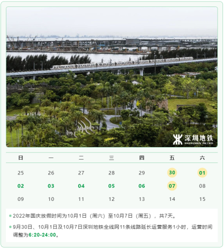 结合目前深圳市疫情防控形势及节假日客流高峰预警,国庆节期间深圳地铁将持续对管辖范围内的重点车站加强疫情防控,严格执行列车消毒、加强车站保洁及消毒、加强车站及轨道区域通风换气。