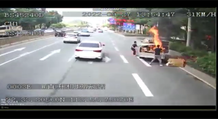 迅速拿起车载灭火器冲向起火车辆