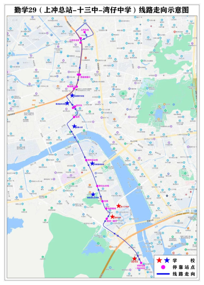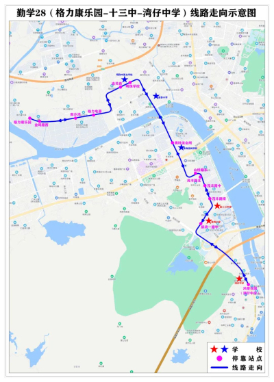 为合理调整资源配置,结合新开的勤学27、28、29路服务覆盖,“湾仔中学-华发新城”专线暂停运营。