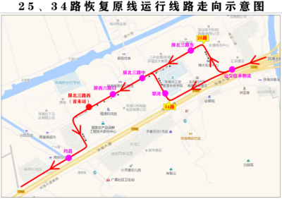 25、34路往吉大、拱北方向维持现状运行路线不变。同时,为方便南屏科技园屏西片区员工市民出行,恢复实施“屏北三路东”、“屏北三路中”、“屏西六路口”站乘客可免费乘坐25路或34路至“屏北三路西”站的换乘措施。