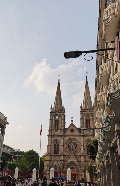 再走过来一点,你会看到一处哥特式的建筑,名叫石室圣心大教堂,它是中国华南地区最大的花岗岩造哥特式教堂,在外观看起来巍峨壮观且气势非凡,整座建筑稳重庄严,但可惜的是,由于疫情,大教堂不对外开放,只能远远地在外面观赏。