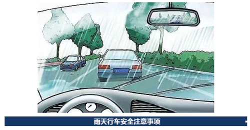 (三)遇路面积水和泥状混合物路面时,要减低车速,避免“水滑”引发车辆侧滑,利用道路两侧的树木、电线杆、交通标志等判断行驶路线。