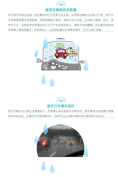 雨天行车驾驶人视线受到一定影响,必须始终保持精力高度集中,特别是视神经中枢,长期高度集中很容易出现视觉及身体疲劳,因此出行前,一定要保证良好的身体状况,切勿勉强、疲劳驾驶。