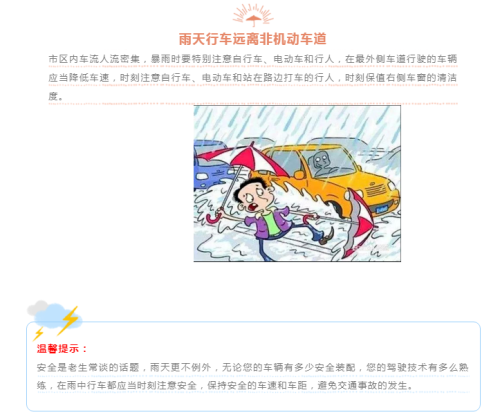 (二)在暴雨等恶劣天气下行驶时,应严格控制车速,保持安全车距,必要时开启雾灯、示廓灯。行驶中应缓踩油门及制动踏板,握稳方向盘,转向时应相应增大转弯半径,避免急打方向盘转向。