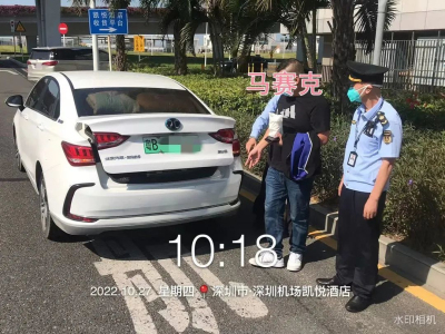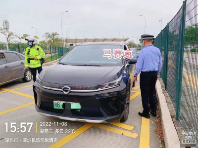 10月27日上午,交通执法人员在机场空港六道开展执法行动,对一辆粤B号牌的白色小轿车进行例行检查。车上载有2名乘客,但该趟行程无订单。