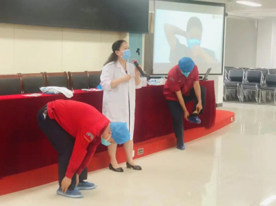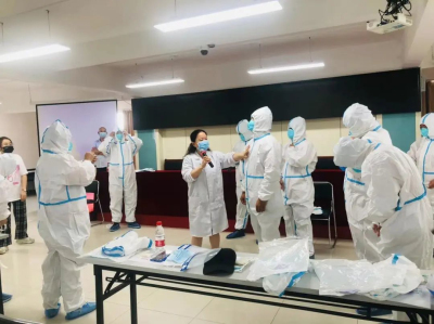 培训分为基础知识讲解以及现场实操演练,课程内容涵盖物资准备、手卫生消毒、公共场所的个人消毒防护、防护服隔离衣等防疫装备的穿脱步骤。支援人员在医护老师指导下,对涉及转运任务的各个环节的消毒防疫技能进行了充分的实操演练。