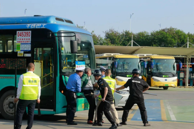 04● 公交场站门口发生暴力砍杀事件反恐演练公交场站上下客点处,一醉酒男语无伦次大吵大闹要乘车,车队保安员、管理人员对其行为劝阻。该男子拦住一辆公交大巴,拿出砍刀想要袭击乘客,后被成功制止。