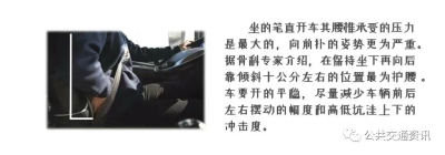 坐的笔直开车其腰椎承受的压力是最大的,向前扑的姿势更为严重。据骨科专家介绍,在保持坐下再向后靠倾斜十公分左右的位置最为护腰。车要开的平稳,尽量减少车辆前后左右摆动的幅度和高低坑洼上下的冲击度。减少紧急制动,拒绝超速行驶,以保持腰部、颈部的舒适。平时注意锻炼身体,跑步、打球、转颈运动、打太极拳等运动,对腰部不适很有帮助。