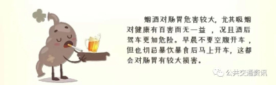 烟酒对肠胃危害较大,尤其吸烟对健康有百害而无一益,况且酒后驾车更加危险。早晨不要空腹开车,但也切忌暴饮暴食后马上开车,这都会对肠胃有较大损害。