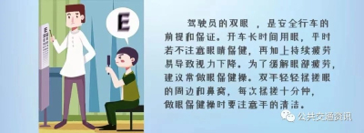 驾驶员的双眼,是安全行车的前提和保证。开车长时间用眼,平时若不注意眼睛保健,再加上持续疲劳易导致视力下降。为了缓解眼部疲劳,建议常做眼保健操。双手轻轻揉搓眼的周边和鼻窝,每次揉搓十分钟,做眼保健操时要注意手的清洁。