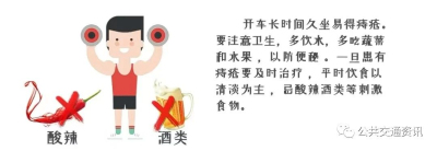 开车长时间久坐易得痔疮。要注意卫生,多饮水,多吃蔬菜和水果,以防便秘。一旦患有痔疮要及时治疗,平时饮食以清淡为主,忌酸辣酒类等刺激食物。