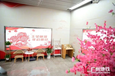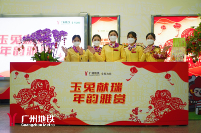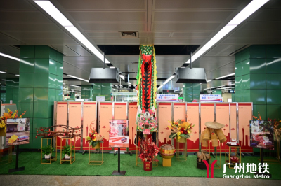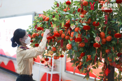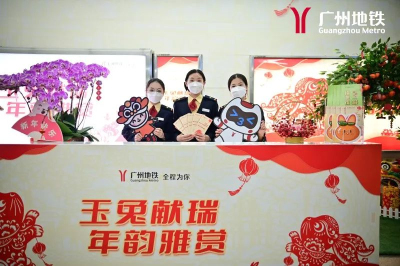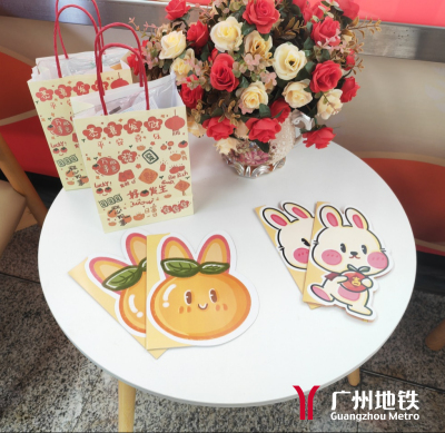 车站推出“搭地铁 游广州”古村系列主题展,摆放小龙舟、农耕工具和麒麟等实物工艺,传承发扬优秀传统文化、岭南文化、广府文化。同时,深挖广东年俗,在“平安驿站”附近,设新春大吉树绿植、花卉装饰,乘客可书写新春愿望及祝福语寄挂大吉树,拍照留下最美春运回忆照片。另外,羊角设计兔年大吉异形卡,配以暖宝宝、口罩组合爱心福袋,为返乡旅客送上浓浓的粤味祝福。