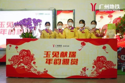 坚守岗位提供贴心春运服务。春运启动以来,广州地铁便以“玉兔献瑞 年韵雅赏”为主题,在线网换乘站、主要枢纽站共49个站点车控室、客服中心布置春节装饰,各车站的LED门匾、LCD一体机也在滚动发布贺年祝福语和海报,让乘客一走进车站就能感受到浓浓的年味。其中1月7日至1月21日,广州地铁在广州南站、广州火车站、滘口、广州东站、机场南、机场北、天河客运站7个重点枢纽车站为乘客提供“平安出行服务”,包括设置“平安驿站”、组建“平安春运”守护团,主动为乘客提供行李打包搬运及导乘、药箱、针线盒、尼龙绳等系列便民服务。同时,在与客运枢纽相接的车站边门处设置“春运绿色通道”,引导乘客快速通行,并联合志愿者协会、街道等单位在地铁广州火车站、从化客运站等交通枢纽站提供志愿者服务,为赶路的乘客提供便利。