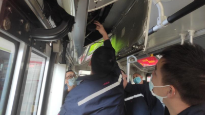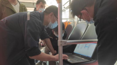 图说:学员与老师在车厢内检修新能源汽车线路
