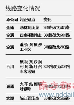 6条线路合并后,一些线路出现了重复的情况。如之前金通公司的388路(202路)和百川公司的303路(206路),从南玄毛织厂到汽车站,28个站点都全部一样。