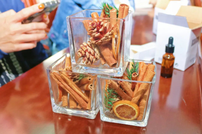 肉桂无火精油扩香制作在轻松愉悦的氛围中展开,大家对自己的“作品”精雕细琢,先用肉桂做打底,将柠檬片放到精致美观的玻璃瓶内,加入小松果和千层金增加装饰,最后滴入自己喜欢的精油,就DIY成了属于自己独一无二的无火精油扩香,一瓶瓶扩香散发出令人心旷神怡的香味。
