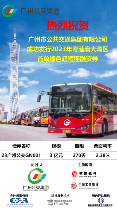 2023年3月14日,在广州市国资委、集团领导的指导下,广州市公共交通集团有限公司成功发行2023年粤港澳大湾区首单绿色超短期融资券,债券简称“23广州公交GN001”,规模3亿元,期限270天,票面利率2.38%,为近期AAA地方国企270D绿色超短融最低利率水平。