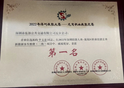 2022年,李文忠参加了深圳技能大赛——龙岗区职业技能竞赛,理论实操考试表现出色,最终获得新能源客车维修(三级)项目第一名的成绩,荣获“龙岗区技术能手”。
