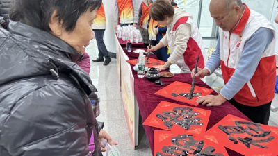 在“幸福出行”摊位,书法协会老师挥毫,向司乘人员和过往乘客送上迎春“福”字和新春祝福。