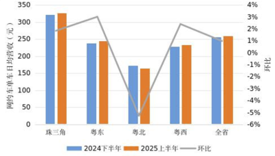 4.本统计期内,全省日均订单≥10单的网约出租车中,单车日均营收约259.19元,较2024年下半年增长0.98%,其中,珠三角地区单车日均营收约327.27元,较2024年下半年增长1.83%;粤东地区单车日均营收约245.10元,较2024年下半年增长3.01%;粤西地区单车日均营收约233.24元,6较2024年下半年增长2.40%;粤北地区单车日均营收约163.49元,较2024年下半年下降5.28%。
