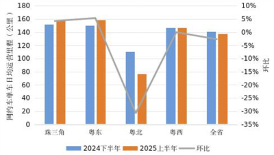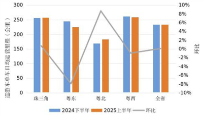 2.本统计期内,全省巡游出租车单车日均运营里程约233.70公里,较2024年下半年增长0.07%,其中,珠三角地区日均运营里程约257.08公里,较2024年下半年增长0.70%;粤东地区日均运营里程约225.00公里,较2024年下半年下降7.96%;粤西地区日均运营里程约259.33公里,较2024年下半年下降0.98%;粤北地区日均运营里程约183.20公里,较2024年下半年增长8.66%。